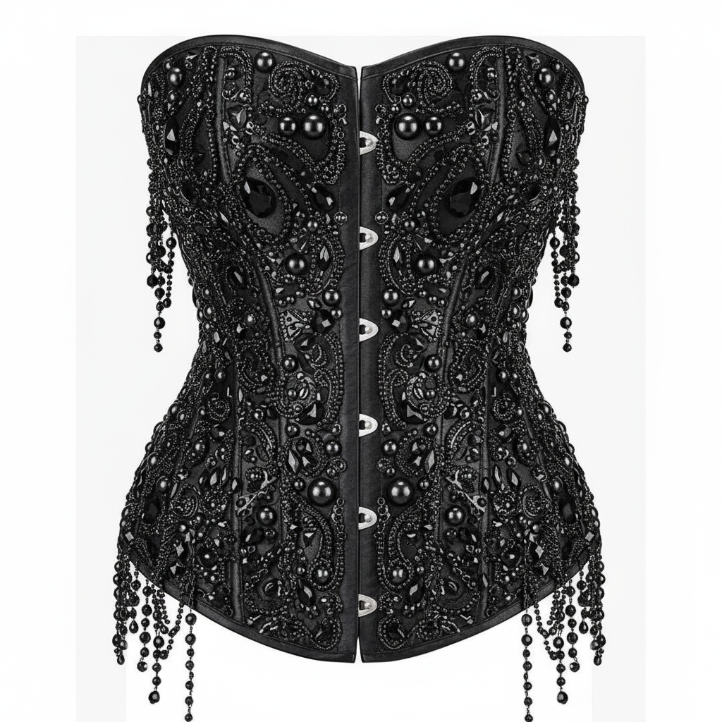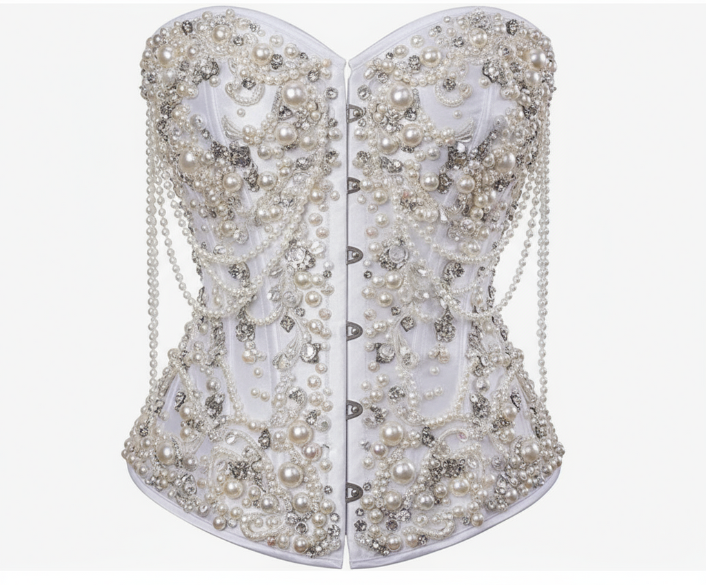 Get your own custom decked out rhinestone, pearl and fringe corset custom made. Each design is different and free hand sewed by our team. Specialty item *last photo